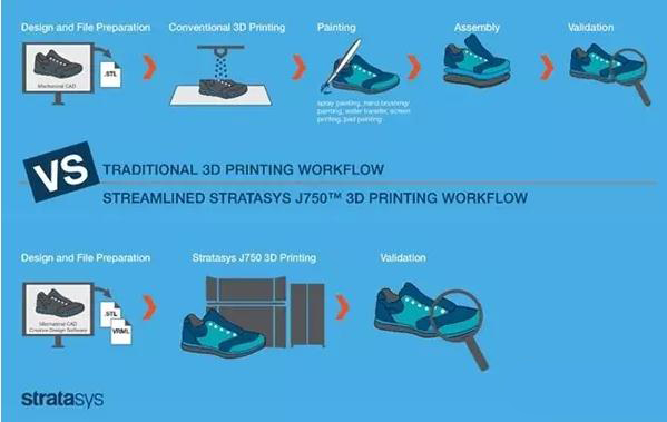 从上图我们可以看到,J750只需一次打印作业就制造出了一只完整的运动鞋。“这款3D打印机最重要的一点就是突破了现实的门槛。”Stratasys公司首席商务官Josh Claman说。