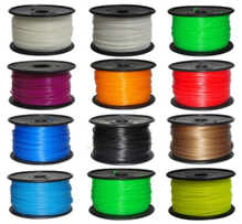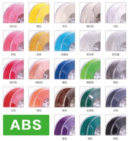 桌面机耗材主要有ABS和PLA,耗材均是直径1.75mm的卷装线材,单卷线材重量1kg。两种材料均有20多种颜色可选择,包括白色、乳白色、黄色、红色、黑色、灰色、绿色、橙色等等 ABS :强度高、韧性好、易于加工成型的热塑型高分子材料。 PLA :能生物降解外,生物相容性、光泽度、透明性、手感和耐热性较好。